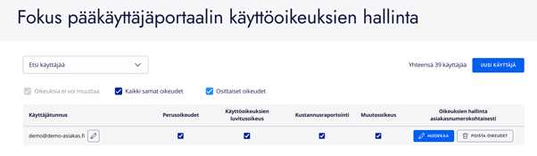 Pääkäyttäjä voi muokata käyttöoikeuksia seuraavasti: